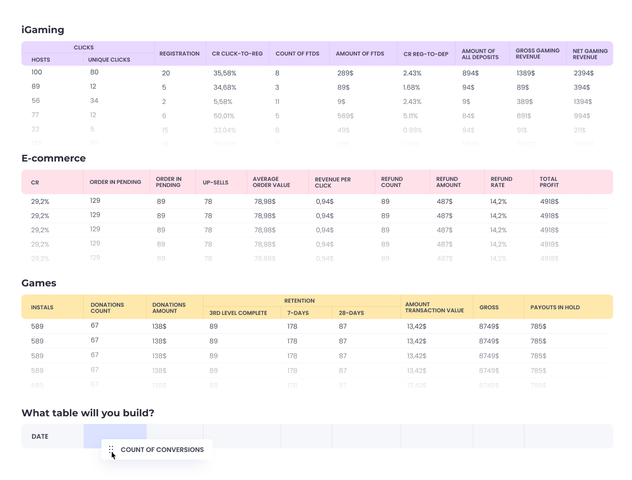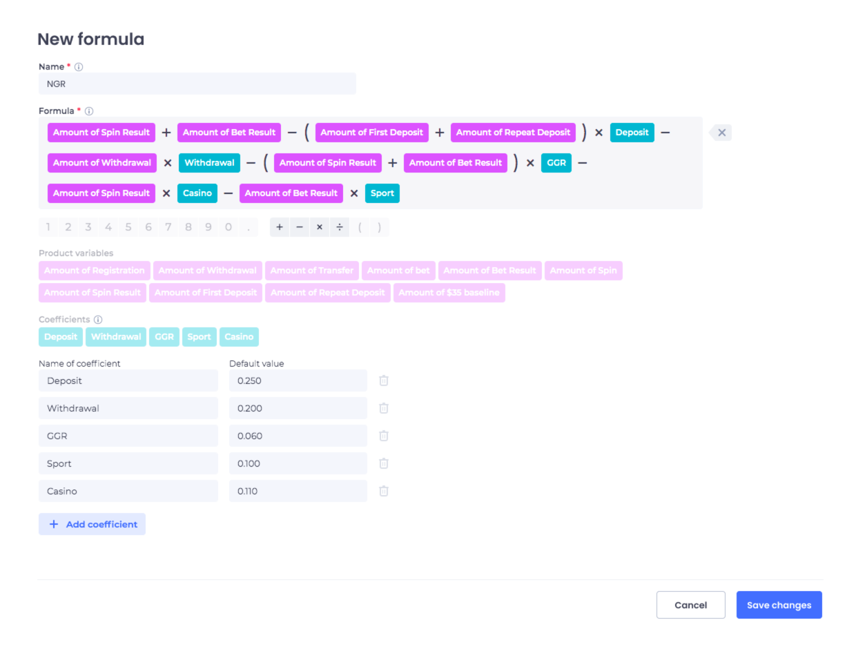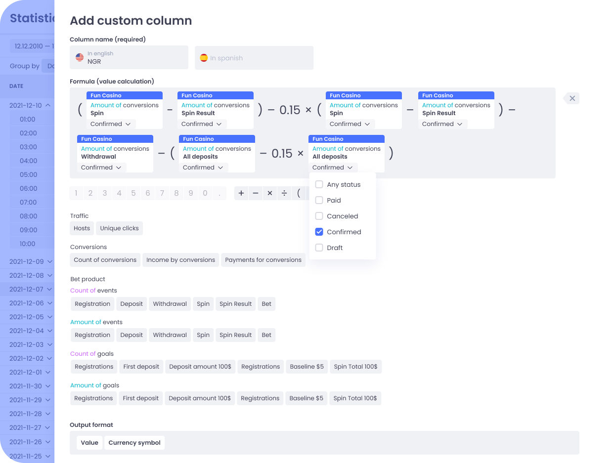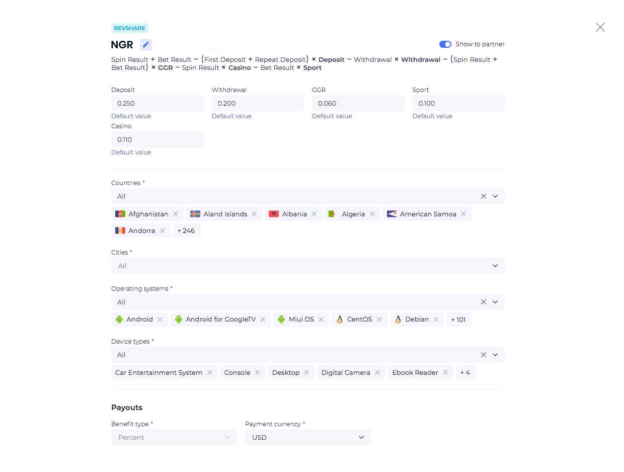 for RevShare using formulas that you set yourself: NGR, net income, and others.